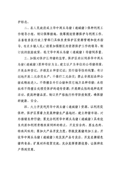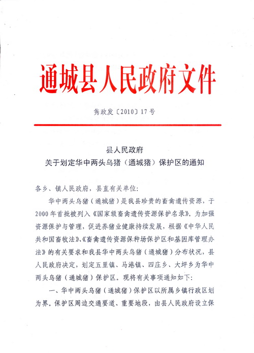 由县 划定饲养通城纯种母猪多、未开展三元杂交、交通相对闭塞的五里、马港、四庄、大坪等四个边远山区的乡镇为通城猪保护区。在县城所在地隽水镇建立“通城县生猪中心人工授精站”,在五里、马港、四庄、关刀、北港建立乡镇联片“生猪人工授精站”。使人工授精站和保护区的通城种公猪头数稳定在现有的15头(即通城猪每个公猪血统的另一头公猪),并使保护区内的通城母猪数基本稳定在现有的5000头左右。