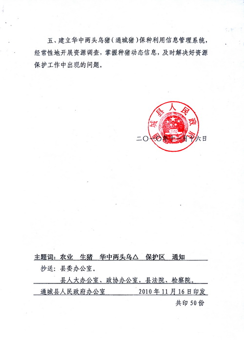 ⑷ 加强对保护区种猪的监管。由县人民 下文规定:保护区内以生产通城猪原种为主,适当开展二元杂交,不搞三元杂交,禁止引进其它品种母猪,人工授精站养什么品种公猪由县畜牧局决定,严防群体混杂。作好保种基地村种猪的鉴定与登记,专人管理选种选配和饲养管理档案。